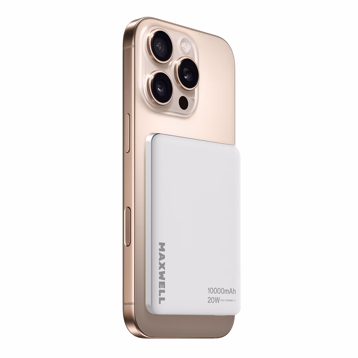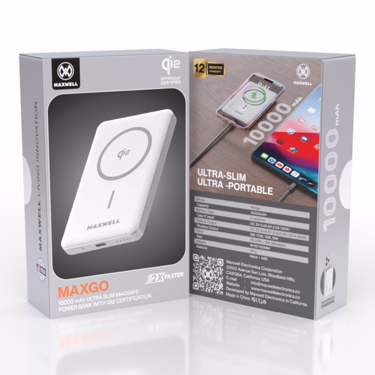 پاوربانک Maxwell MAXGO از باتری لیتیومپلیمری بهره میبرد که علاوه بر ایمنی و پایداری عملکرد، امکان طراحی باریکتر را فراهم کرده است. بدنه این پاوربانک از ترکیب فلز و ABS ساخته شده که ضمن حفظ وزن پایین، استحکام مناسبی در استفاده روزمره ایجاد میکند. طراحی ساده و یکدست آن در رنگ سفید، کاملاً با سبک دستگاههای مدرن بهویژه گوشیهای آیفون هماهنگ است.