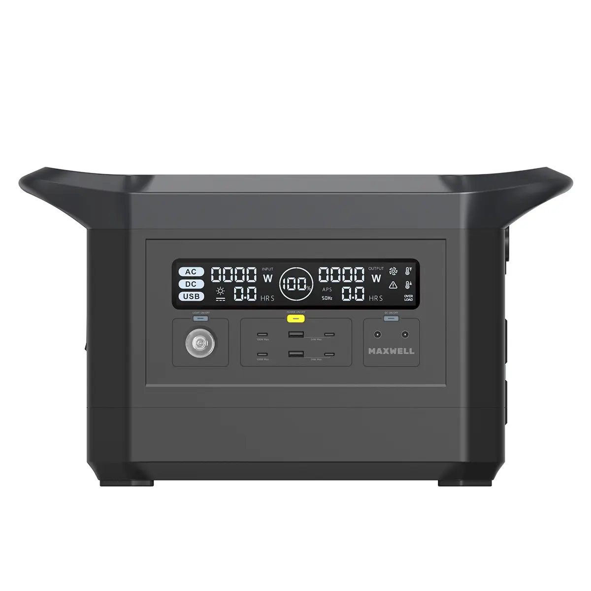 بدنه پاور استیشن مکسول 2000 وات با ابعاد 45.6 × 21.9 × 26.2 سانتیمتر طراحی شده و با وجود توان و ظرفیت بالا، چیدمان منطقی و متعادلی دارد. وزن خالص 20 کیلوگرم نشاندهنده کلاس حرفهای این پاوراستیشن است و برای جابهجایی آسانتر، در دو طرف بدنه دستگیرههای مجزا تعبیه شده تا حمل دستگاه در سفر، خودرو یا کمپینگ سادهتر و ایمنتر انجام شود.