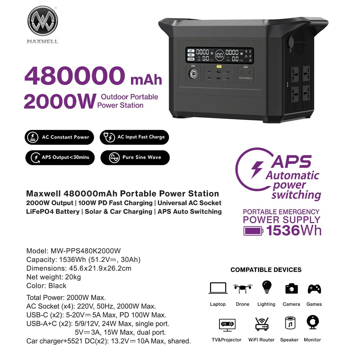 پاور استیشن Maxwell MW-PPS480K2000W یک منبع برق قابلحمل پرقدرت با توان خروجی 2000 وات واقعی است که برای استفادههای سنگین در فضای باز، سفرهای طولانی، کمپینگ حرفهای، خودروهای آفرود و شرایط اضطراری طراحی شده است. این مدل با ظرفیت بسیار بالای باتری، خروجی پایدار AC و تنوع گسترده درگاهها، امکان استفاده همزمان از چندین دستگاه و حتی لوازم برقی کوچک را خارج از شبکه برق شهری فراهم میکند.