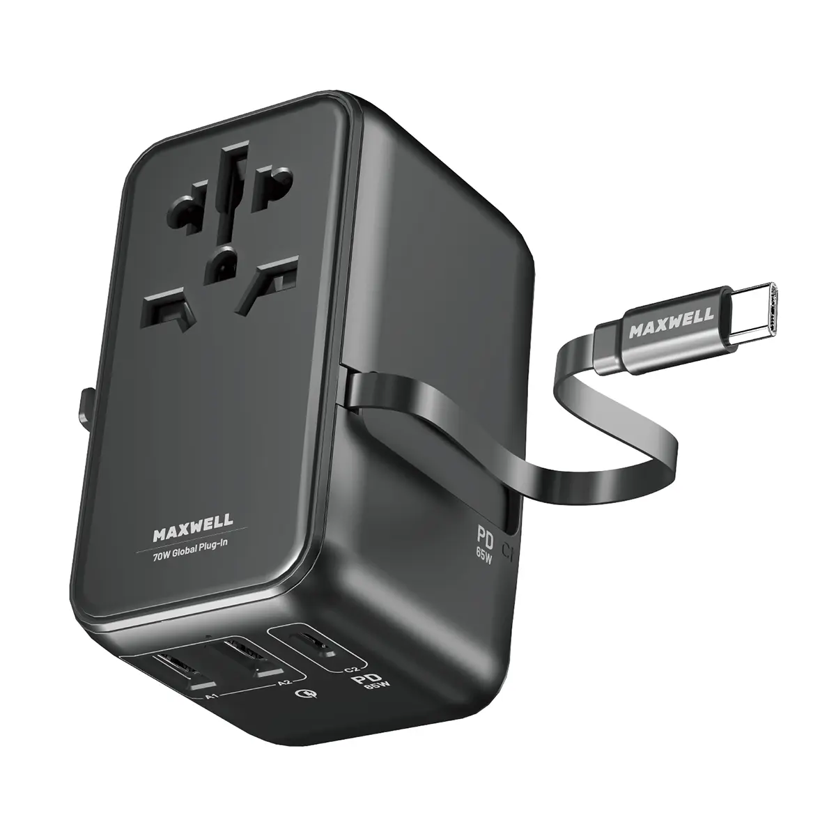 آداپتور مسافرتی 70 وات مکسول دارای چهار خروجی شارژ شامل کابل تایپ‌سی داخلی، یک پورت USB-C و دو پورت USB-A است.