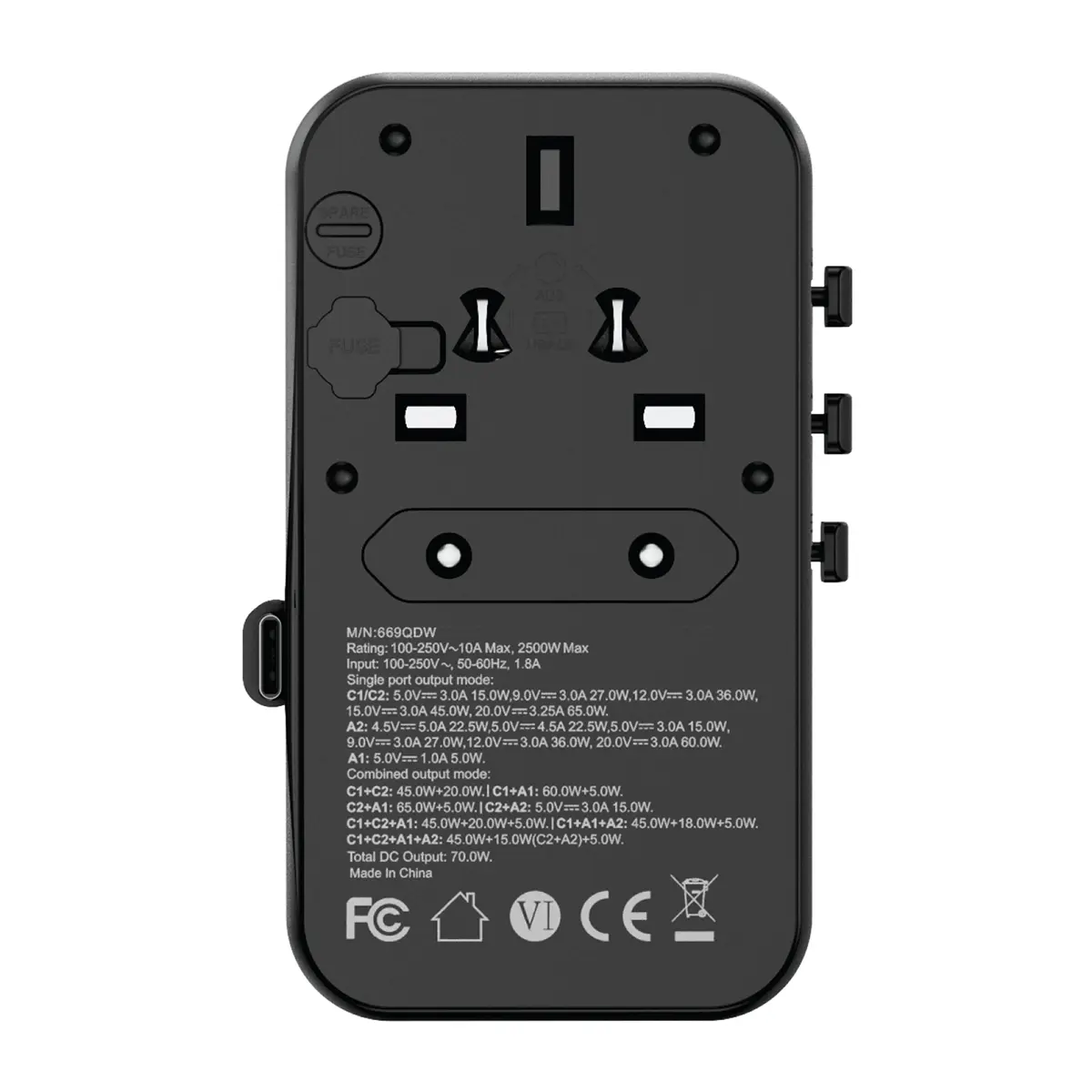 این مدل به یک سوکت برق یونیورسال مجهز است که با طیف گسترده‌ای از دوشاخه‌ها و پریزهای برق بین‌المللی سازگاری دارد. طراحی مولتی‌سوکت باعث می‌شود اتصال انواع استانداردهای رایج جهانی بدون نیاز به تبدیل جداگانه امکان‌پذیر باشد و کاربری آداپتور در کشورهای مختلف با ساختار برق متفاوت حفظ شود.