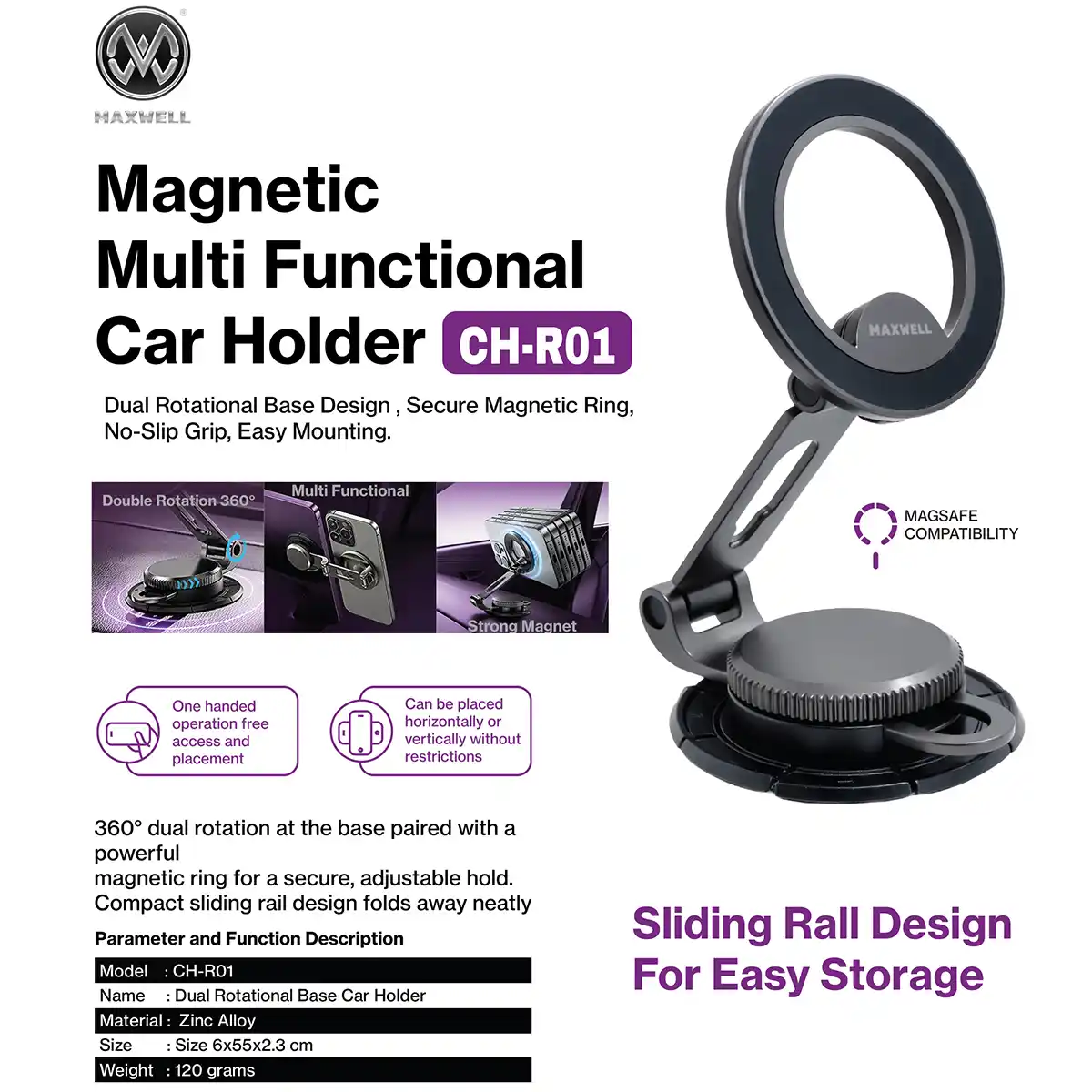 هولدر مگنتی و مگسیف Maxwell مدل CH-R01 یک پایه نگهدارنده چندمنظوره است که مکسول آن را با تمرکز بر استحکام ساخت، اتصال مغناطیسی پایدار و قابلیت تنظیم انعطافپذیر طراحی کرده است. این هولدر با پشتیبانی از فناوری MagSafe، اتصال ایمن و دقیق به گوشیهای سازگار را فراهم میکند و از یک حلقه مغناطیسی قدرتمند برای نگهداری مطمئن دستگاه استفاده میکند.
