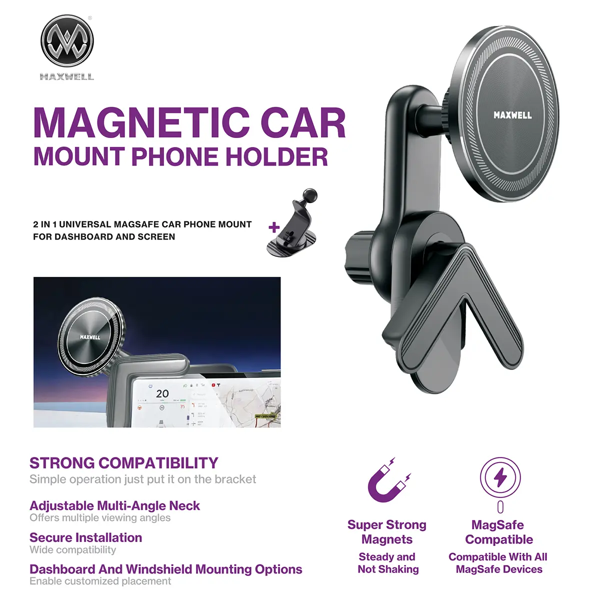 هولدر و نگهدارنده مغناطیسی خودرو مکسول یک پایه نگهدارنده چندمنظوره برای نصب تلفن همراه در فضای داخلی خودرو است که با طراحی ۲ در ۱ امکان استفاده روی داشبورد، شیشه جلو یا مانیتور خودرو را فراهم میکند. این محصول با پشتیبانی از استاندارد MagSafe، اتصال سریع و پایدار گوشی را بدون نیاز به گیرههای مکانیکی یا تنظیمات پیچیده ممکن میسازد.