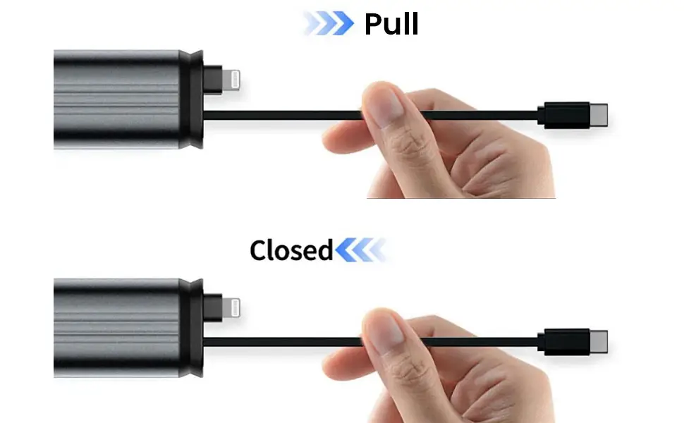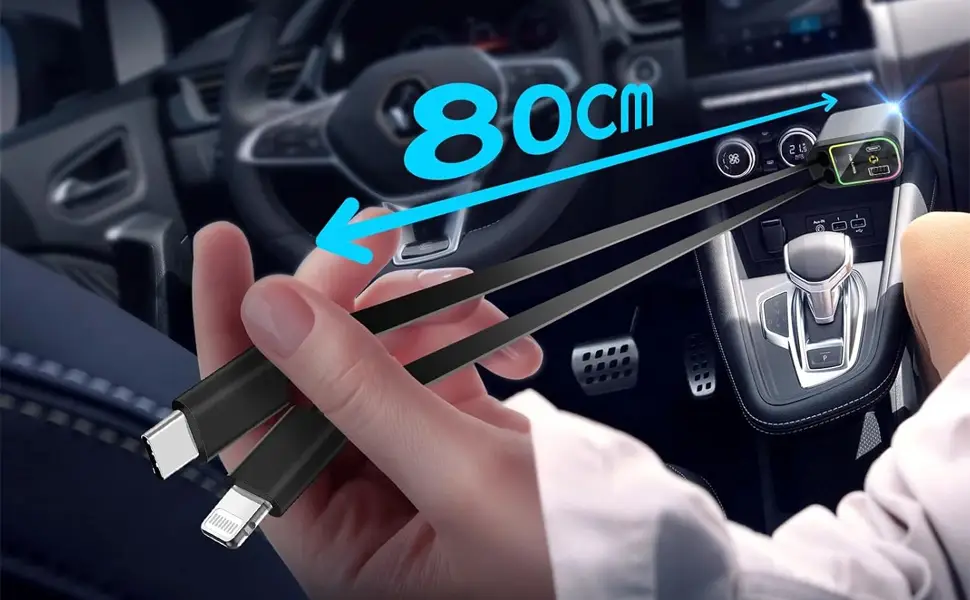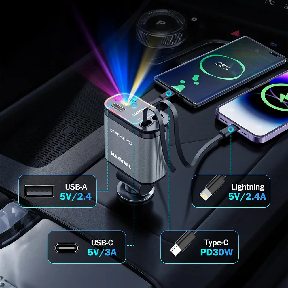 در طراحی شارژر فندکی Maxwell Drive HUB Pro دو کابل جمعشونده تایپ سی و لایتنینگ در نظر گرفته شده است که هرکدام تا 80 سانتیمتر طول دارند. این ساختار باعث کاهش شلوغی فضای داخلی خودرو و جلوگیری از گرهخوردگی کابلها میشود. علاوه بر کابلهای داخلی، یک پورت USB-C و یک پورت USB-A نیز روی بدنه تعبیه شده تا امکان اتصال دستگاههای متنوع بدون محدودیت فراهم باشد.