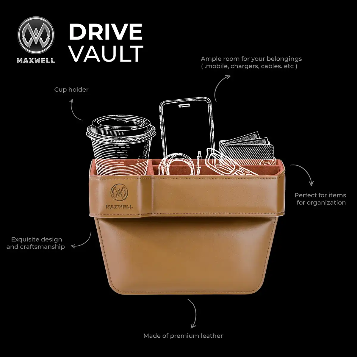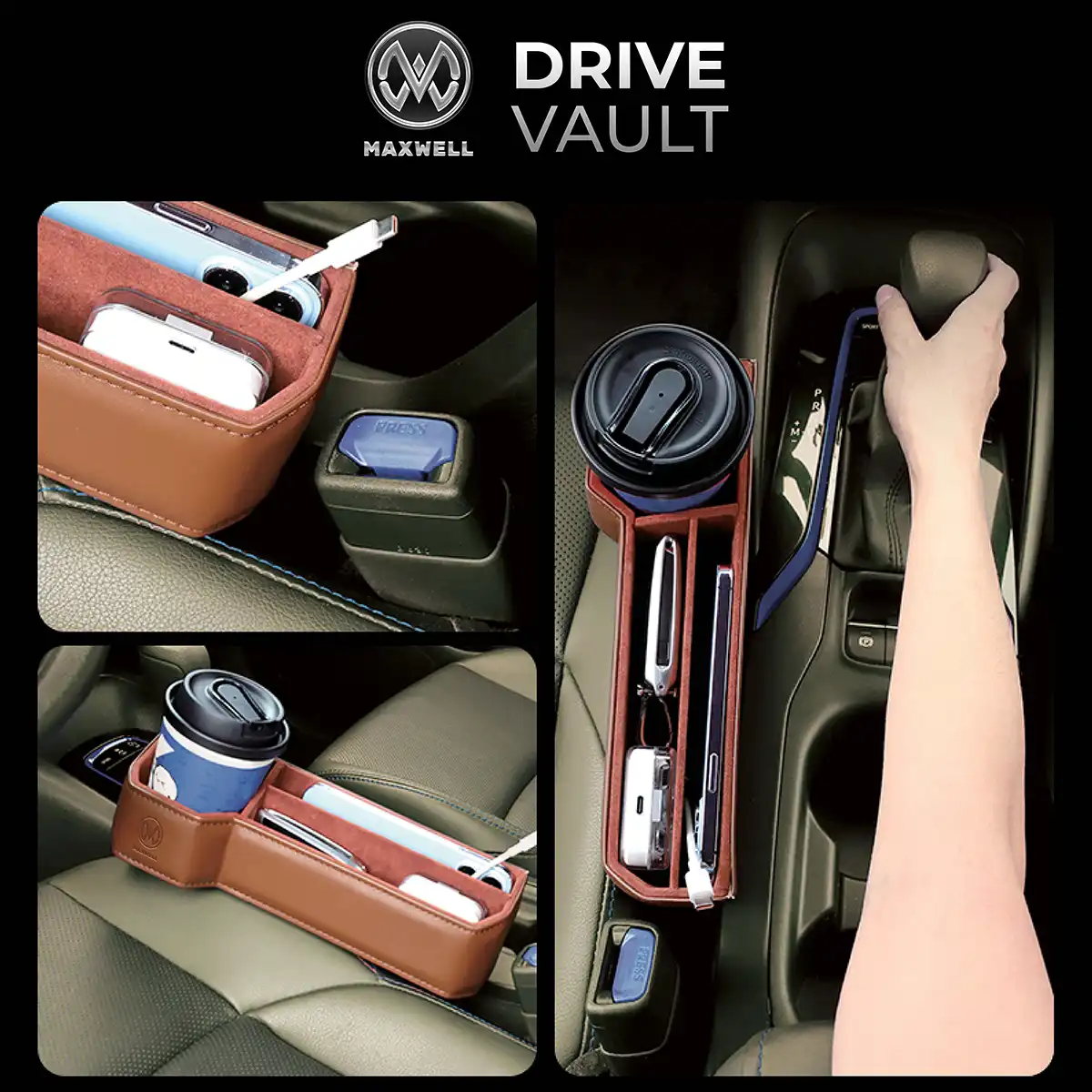کنسول خودرو Maxwell Drive Vault بهعنوان یک فضای ذخیرهسازی جانبی، برای استفاده در شکاف بین صندلی خودرو طراحی شده و نقش مؤثری در افزایش نظم و کارایی فضای داخلی کابین دارد. این محصول با در نظر گرفتن ابعاد استاندارد فضای بین صندلیها، بهصورت دقیق و هماهنگ در کنار صندلی قرار میگیرد و از افتادن وسایل کوچک به داخل شکاف جلوگیری میکند، بدون آنکه مانعی برای حرکت صندلی یا راحتی سرنشین ایجاد شود.