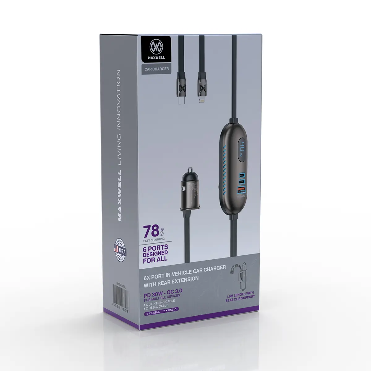 شارژر فندکی مکسول مدل MW Nexonic 02 یک شارژر خودرو 6 پورت با طراحی توسعهیافته و کابل افزایش طول مخصوص صندلی عقب است که امکان شارژ همزمان چندین دستگاه را در خودرو فراهم میکند. این مدل با توان خروجی حداکثر 78 وات، پشتیبانی از فناوریهای PD و QC3.0 و بهرهمندی از کابلهای داخلی Type-C و Lightning، یک راهکار کامل برای شارژ تجهیزات دیجیتال در خودرو محسوب میشود.