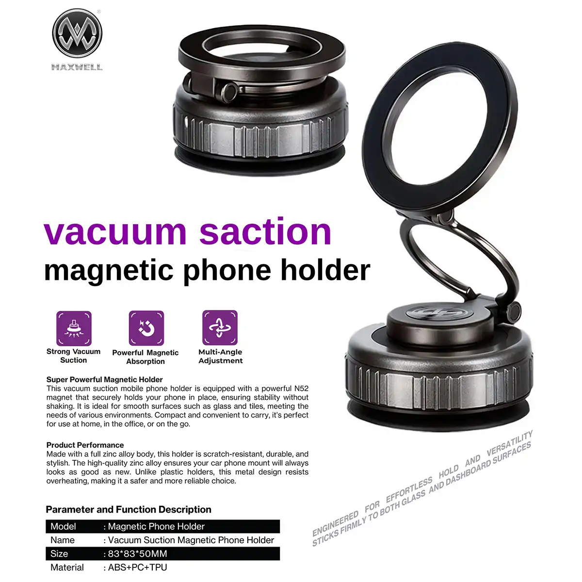 هولدر مکسول مدل Vacuum Suction به آهنربای قدرتمند N52 مجهز است که گوشی را با جذب مغناطیسی قوی و بدون لرزش نگه میدارد. این سیستم مغناطیسی، ثبات گوشی را حتی در شرایط رانندگی و مسیرهای ناهموار حفظ میکند و از جدا شدن یا لغزش دستگاه جلوگیری مینماید.