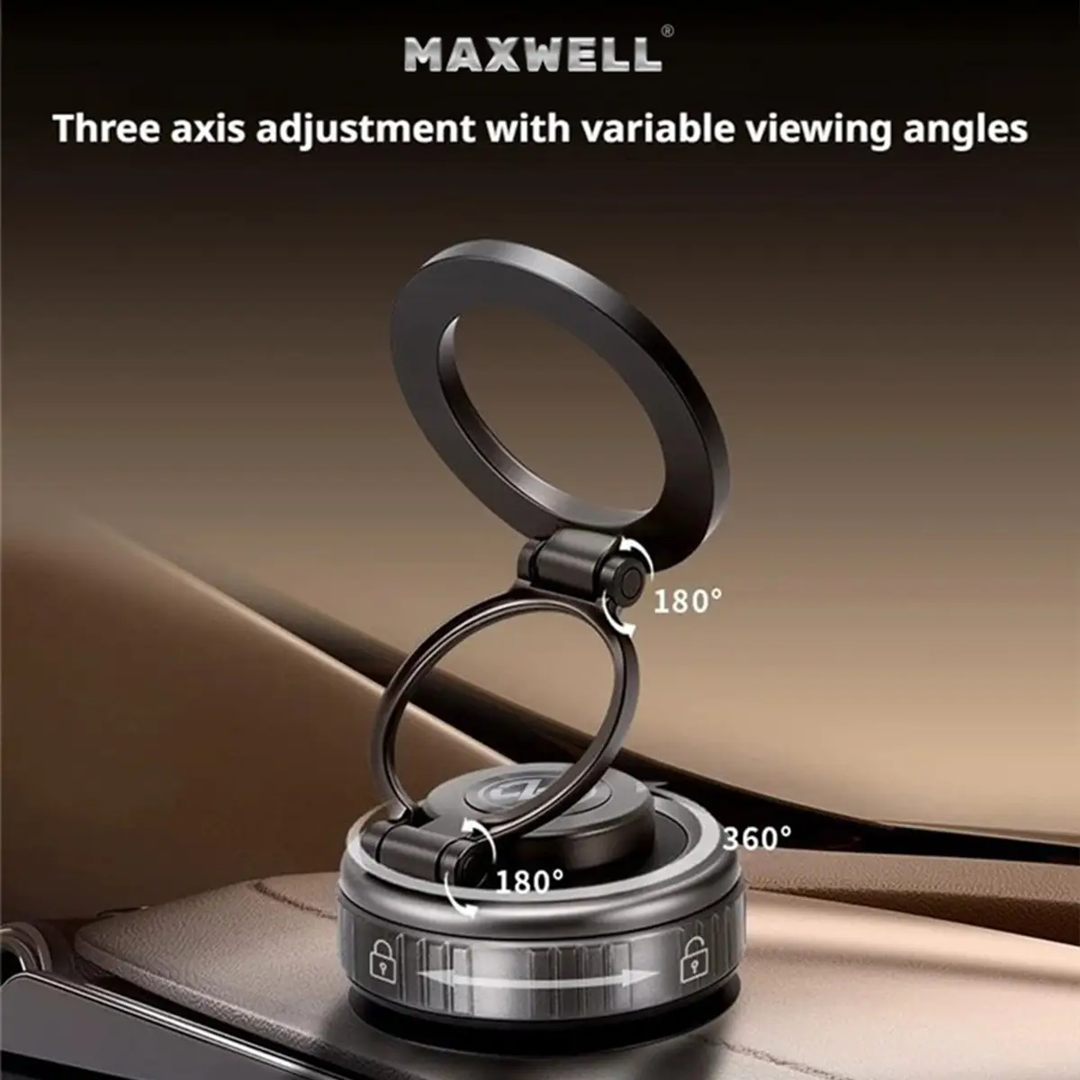 این مدل از سیستم تنظیم سهمحوره بهره میبرد و امکان تنظیم زاویه دید در جهات مختلف را فراهم میسازد. ترکیب این ساختار با چرخش 360 درجهای پایه وکیوم، تنظیم دقیق موقعیت گوشی را بدون شل شدن یا افت استحکام امکانپذیر میکند. طراحی هولدر مکسول Vacuum Suction بهصورت تاشو و جمعشونده انجام شده است. این هولدر در بیشترین حالت باز شده، ارتفاع 135 میلیمتر دارد و در حالت جمعشده، ارتفاع آن به 40 میلیمتر کاهش مییابد. این ویژگی باعث اشغال حداقل فضا در زمان عدم استفاده میشود و ظاهر مرتبتری به فضای داخلی خودرو میدهد.