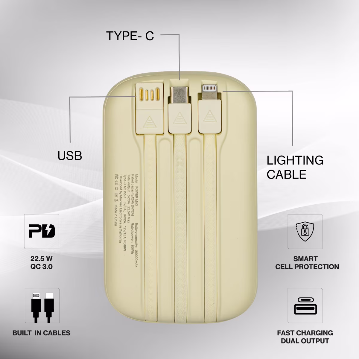 بدنه پاوربانک Maxwell Power Max از متریال مقاوم PC + ABS ساخته شده است که ضمن حفظ وزن متعادل، دوام مناسبی در برابر فشار و استفاده مداوم روزانه دارد.