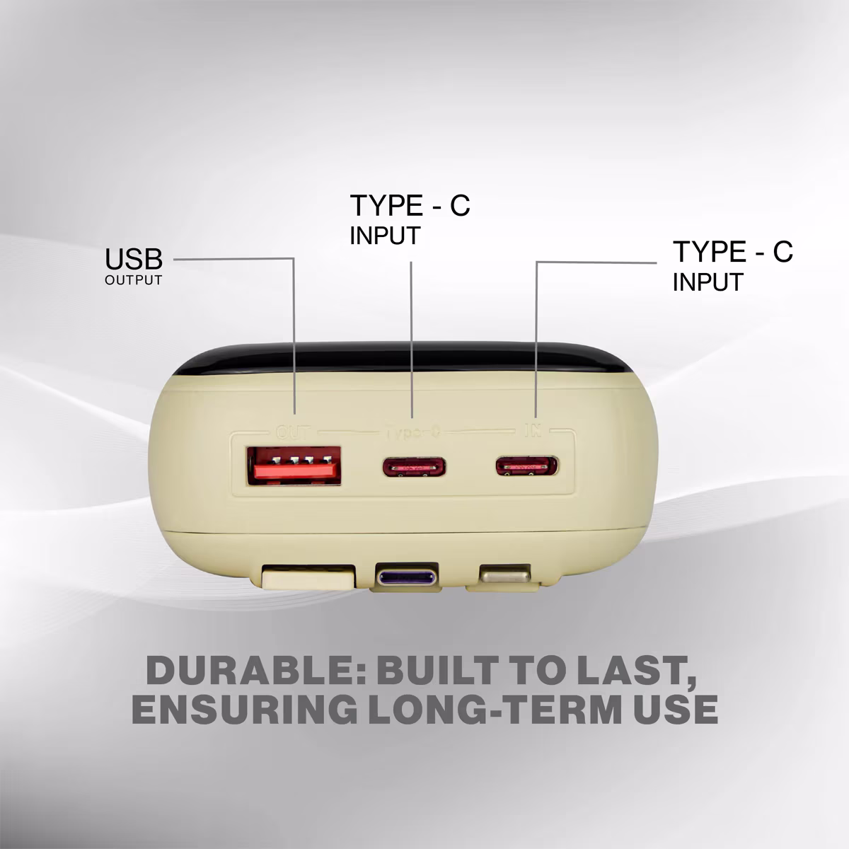 این پاوربانک به چهار خروجی شارژ شامل پورت USB-C، پورت USB-A، کابل داخلی Type-C و کابل داخلی Lightning مجهز شده است که نیاز به حمل کابل جداگانه را تا حد زیادی کاهش می‌دهد و استفاده از آن را ساده‌تر می‌کند.